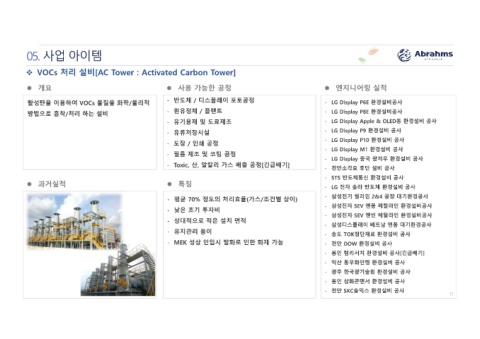 v VOCs 처리 설비[AC Tower : Activated Carbon Tower] l 개요 l 사용 가능한 공정 l 엔지니어링 실적 l 과거실적 l 특징