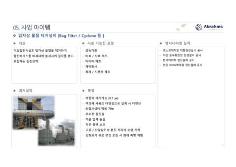 v 입자상 물질 제거설비 [Bag Filter / Cyclone 등 ] l 개요 l 사용 가능한 공정 l 엔지니어링 실적 l 과거실적 l 특징 ㎛)