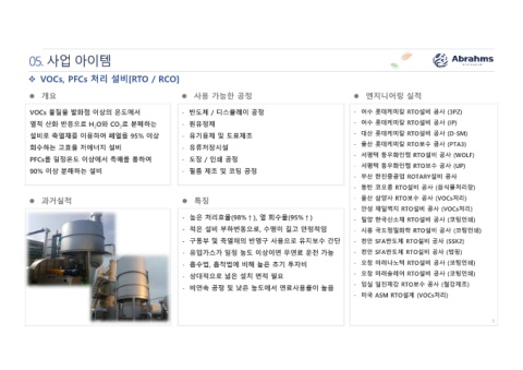 v VOCs, PFCs 처리 설비[RTO / RCO] l 개요 l 사용 가능한 공정 l 엔지니어링 실적 2 2 l 과거실적 l 특징