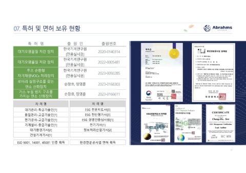 자 격 명 자 격 명 대기관리-특급기술인[1] ESG 전문지도사[3] 품질관리-고급기술인[1] ESG 진단평가사[3] 전기공사-고급기술인[1] ESG 경영인증심사원[1] 기계설비-중급기술인[1] 전기기사(1) 대기환경기사[2] 정보처리산업기사[2] 건설기계기사[1] ISO 9001, 14001, 45001 인증 획득 환경전문공사업 면허 획득
